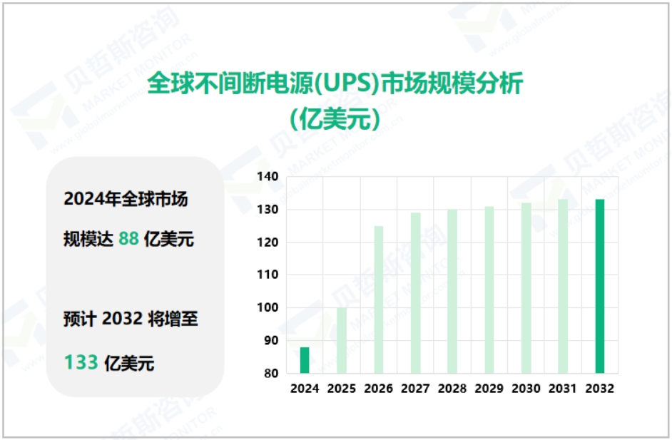 2024年全球不间断电源(UPS)市场规模为88亿美元,预计到2032年将达到约133亿美元。
